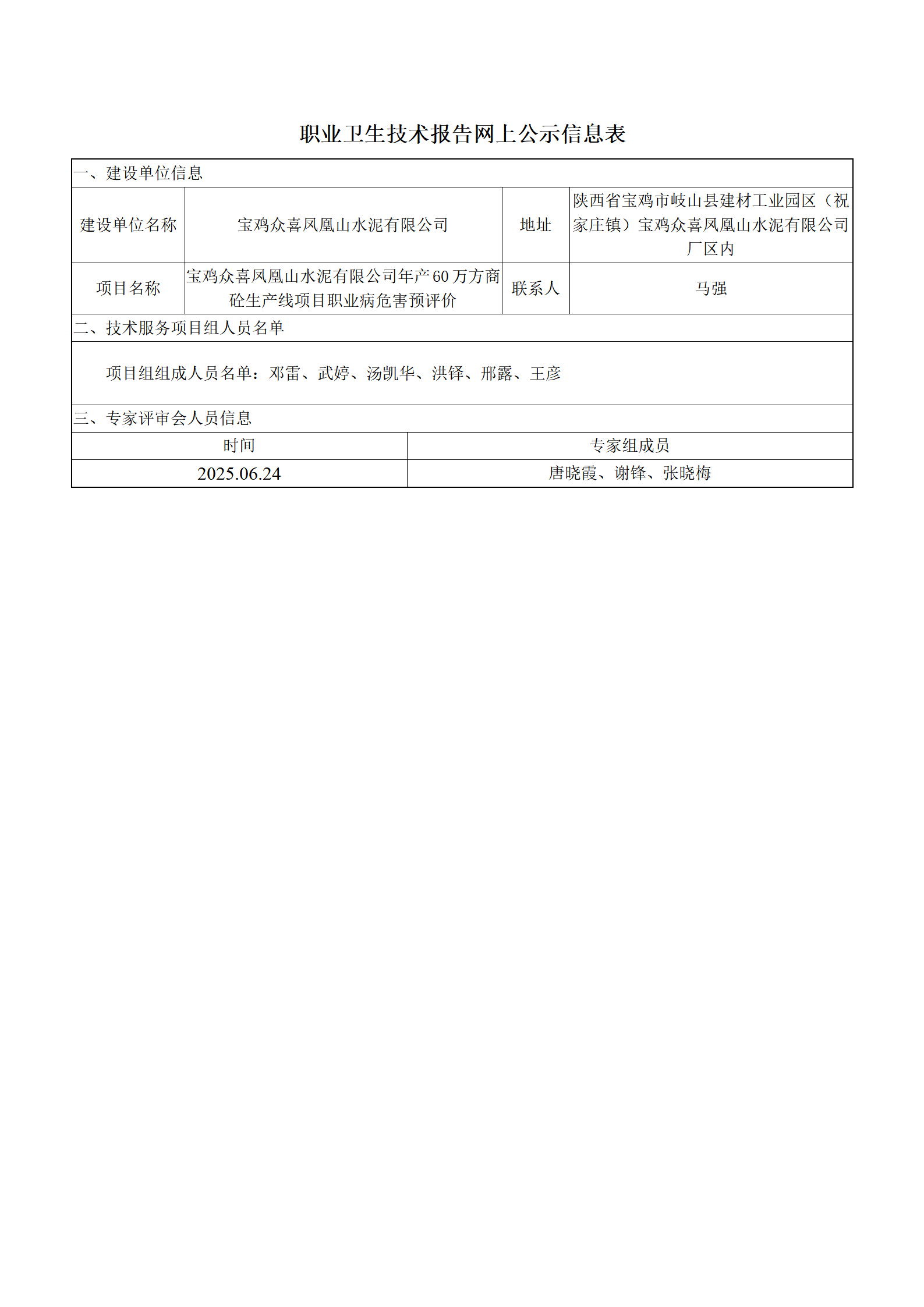 宝鸡众喜凤凰山水泥有限公司年产60万方商砼生产线项目职业病危害预评价