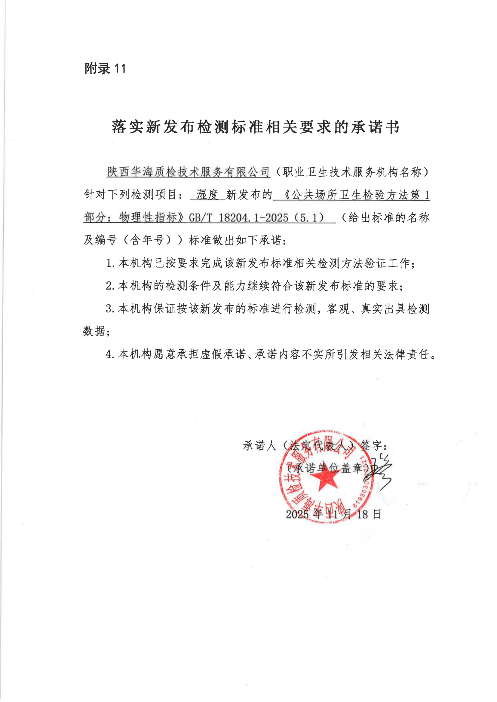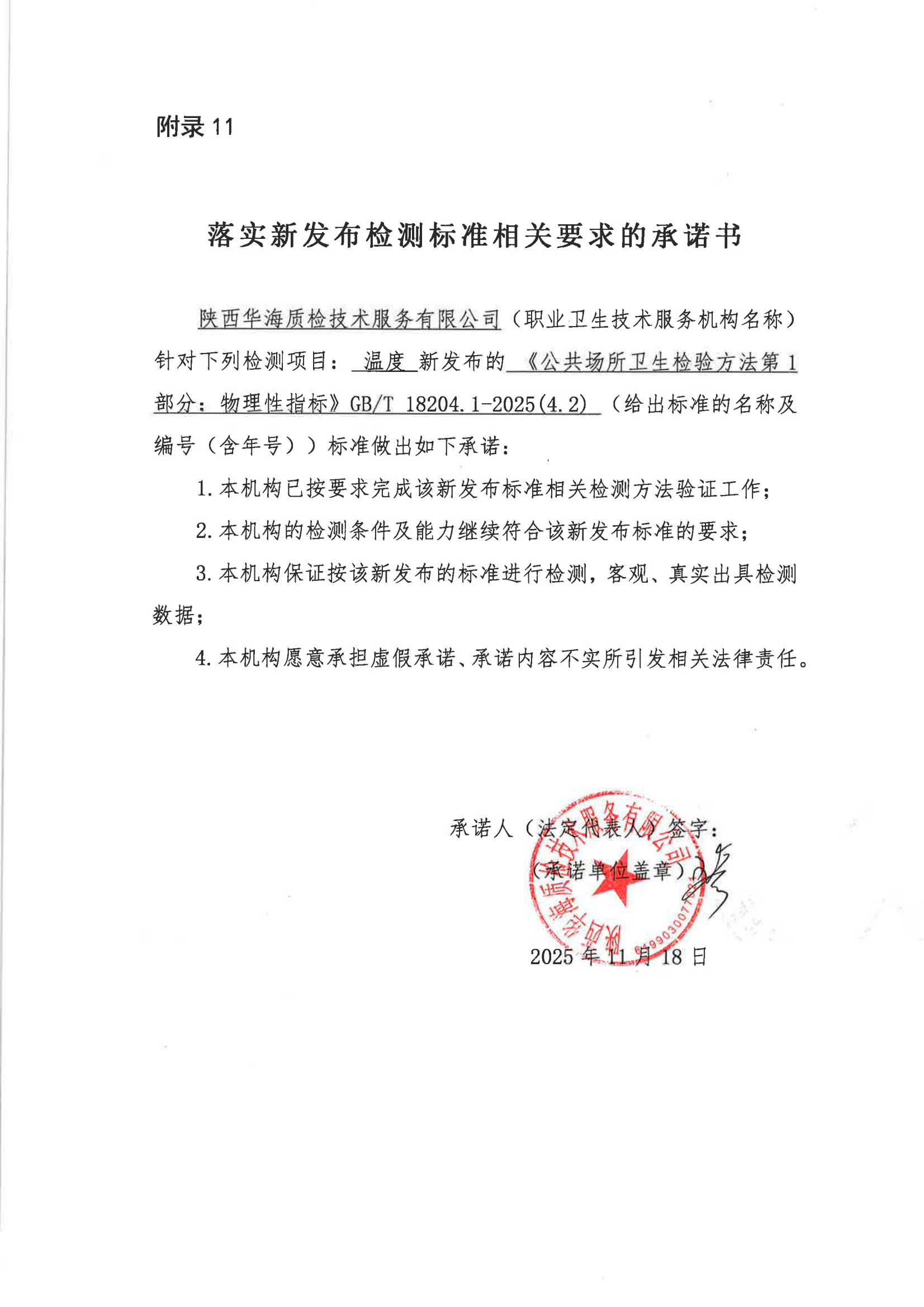 落实新发布检测标准《公共场所卫生检验方法第1部分:物理性指标》GB/T18204.1-2025相关要求的承诺书