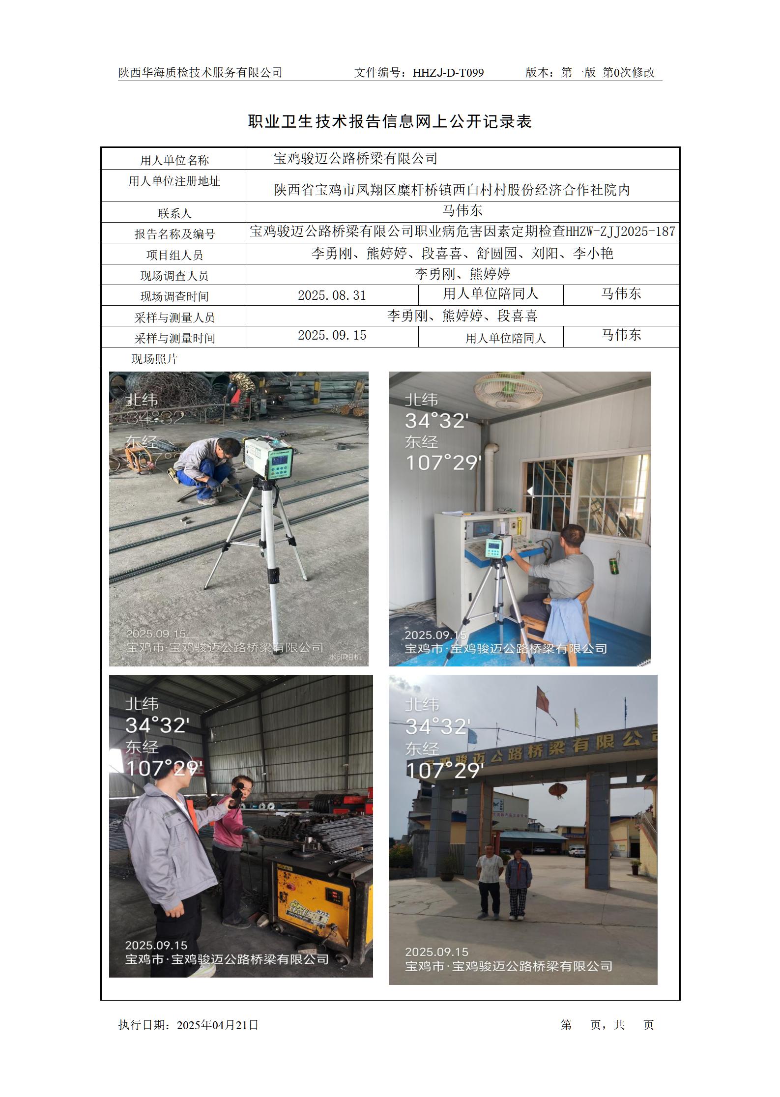 宝鸡骏迈公路桥梁有限公司定期检测 职业卫生技术报告信息网上公开记录表