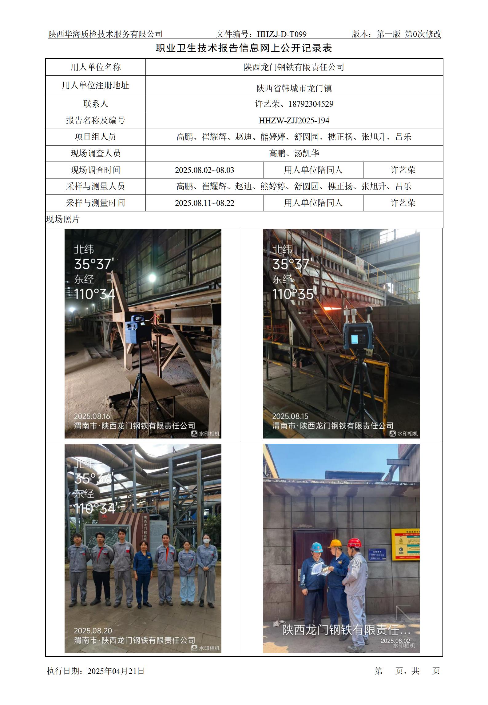 陕西龙门钢铁有限责任公司定期检测 职业卫生技术报告信息网上公开记录表