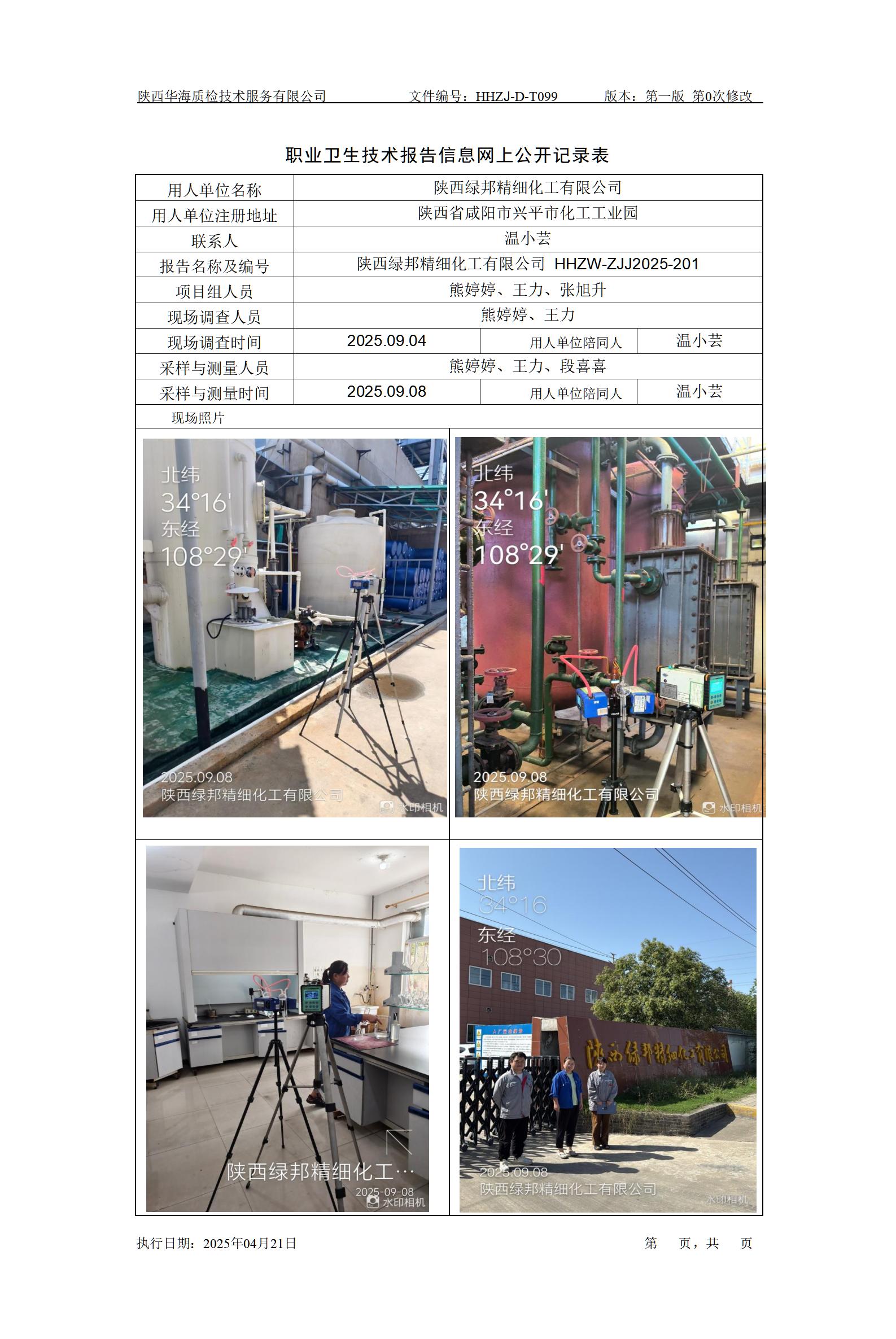 陕西绿邦精细化工有限公司定期检测 职业卫生技术报告信息网上公开记录表