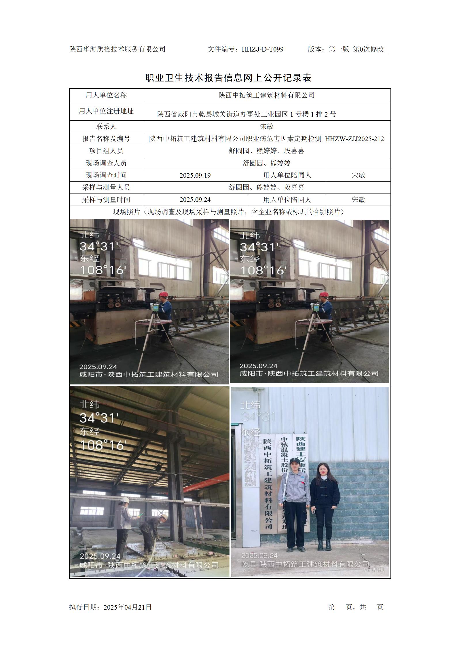 陕西中拓筑工建筑材料有限公司定期检测职业卫生技术报告信息网上公开记录表