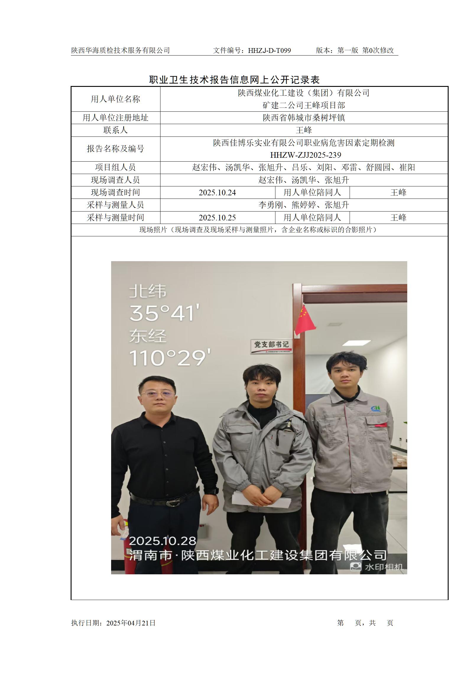 陕西煤业化工建设(集团)有限公司矿建二公司王峰项目部定期检测职业卫生技术报告信息网上公开记录表